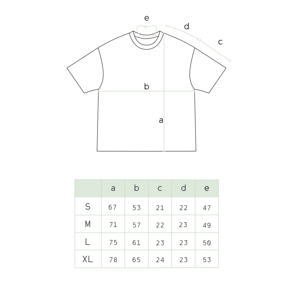 Размеры указаны в сантиметрах. Может быть незначительная погрешность ±1см. e = обхват горловины футболки без учета эластичного воротника.
